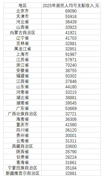 近日,国家统计局网站公布了31个省份2025年居民人均可支配收入情况。数据显示,去年7个省份居民人均可支配收入超过了5万元。